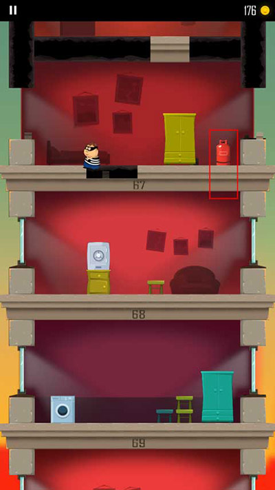 4、角色到达每一个楼层时,里面的东西都会不一样,有些是板凳、冰箱、煤气罐等,下面我为大家来介绍这些东西的作用,冰箱是类似护盾的功能,用来抵挡一次导弹、警察的攻击;