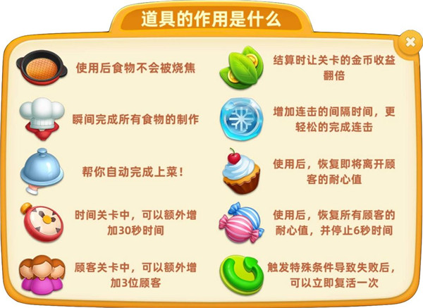 小镇大厨里有各式各样的道具供大厨选择,辅助大厨更好地通关和获取更高的收益。