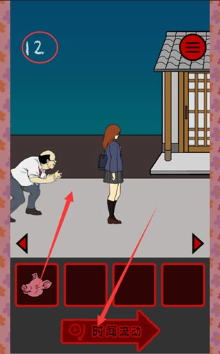 妹子先前进,然后猪头丢到妹子身后让痴汉吃了。再在鸟前面放石头,妹子经过会被石头绊倒,鸟飞起来,妹子顺利回家。