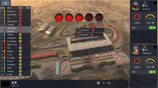 名次:屏幕左侧显示当前赛事的排名,亦会显示出车手名字、车队(以颜色区分)以及轮胎类型/磨损程度。