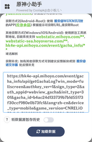 2、在加载方式页面中选择在线地址模式,往下滑,只需要在框内粘贴完整的URL;获取URL的方式:可以使用游创工坊的yuanshenlink应用,根据提示就可以获取链接,随后输入链接,点击加载数据;