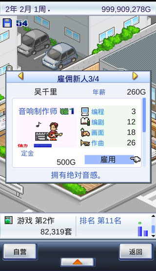 3、你可以雇佣有趣的员工来帮你开发游戏。他们有不同的能力。你必须训练他们更加严肃和专业。