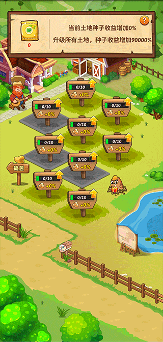 1、种植作物升级土地,收割得种子(前期利用云朵农夫的加倍效果快速得到金币用于升级科技)