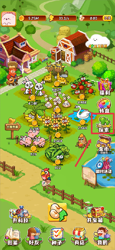 2、前期作物升级之后,不用忙着收割,先把金币产量提升起来,用于开宝箱和探素(每次收割除了土地其他都会清零)