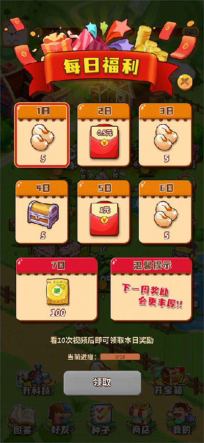 8、每天签到会得到现金奖励、种子、宝箱、化肥等