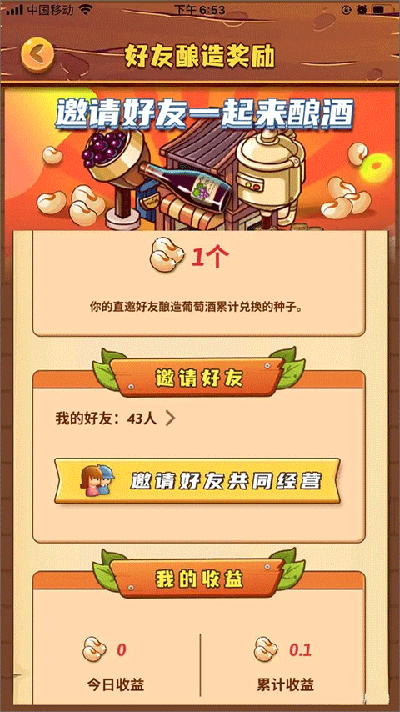 邀请的好友玩葡萄庄园会给上级反种子 10%的比例 。如下图 好友通过葡萄庄园获得了一个种子 可以给我反馈0.1个种子。我邀请的好友大部分人基本没玩 注册了玩一天就下线了 都没办法联系一起玩。