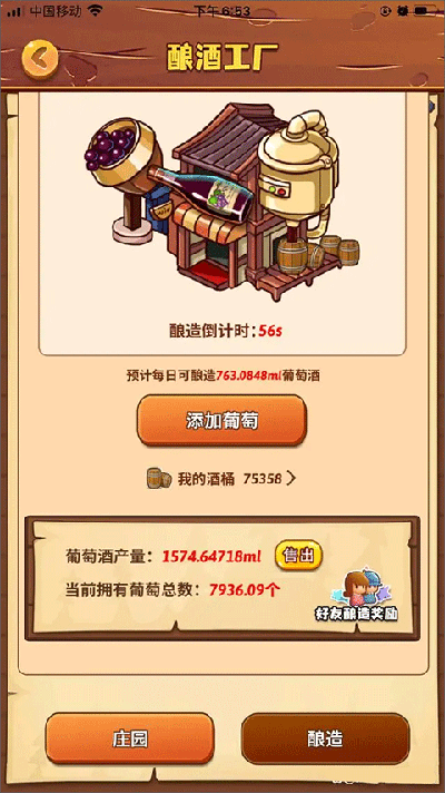 PS: 酒桶这个东西初始化送80000个 在酿造葡萄那刻开始就在消耗 ,这个也不用多说没有就直接补充 每天还可以免费看三个广告补充300个酒桶。