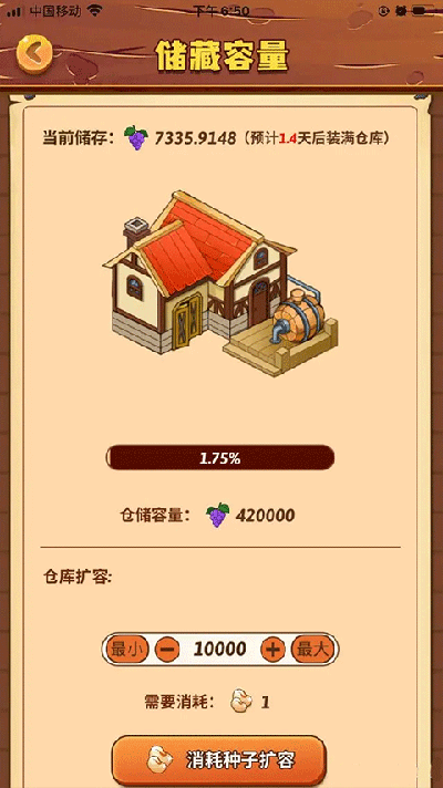 获得地图后就会产生葡萄根据每个地图的产量进行葡萄的生产,初始容量是50000葡萄,我这里是利用豆子扩容到了420000存储。不然忘记时间没有去添加葡萄酿造 。存储满了就不会生产葡萄 导致浪费。