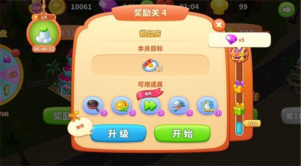 在每次进行关卡前,共有5种道具供大家选择,分别可以实现不同的效果,类似于“食物不会烧焦”“烹饪速度提升”“自动给顾客上菜”“双倍金币加成”“更容易获得连续上菜效果”等,各位镇长可以根据每个关卡的难易程度,自由选择不同的道具进行使用。