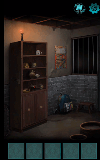 【启】墙上画像(柴米油盐酱醋茶)→柜子背后图案代表左右→右右左左左右右→擀面杖、锤子→墙旁边的链子→书包拿衣服→衣服过水→绑铁栏上→擀面杖拧开→出去