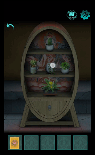 左边屋子→火钳、柜子里的《植物图鉴》看名字→庭院左边植物柜,后面图像呼应名字→得到镜片→左屋→放镜子→折射四个图案和圆点→?代表顺序→风禅莲火→铁牌→去庭院右边墙面加上→得到密码→开大殿门→进入