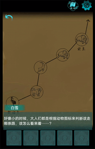 【墓前1】石头、金杯→河里接水→撒(遇水现行)墓碑上→字谜(鼓仙)→前进【墓前2】→移动羊骨石头→填上字谜十豆支人山→得到顺序+【墓前1】书上的名字红带→解开地上的盒子→获得图腾