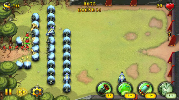 n49, n99 飞机是最难打的,因为 FieldRunners 这个游戏有个问题,就是到 n49, n99 出来的飞机的速度是有变化的,例如 同样是 499 关我用同样的防守布阵,有时要用三全阵,有时又要用一对二阵才能全部消灭飞机,打之前不确定该用那个阵型,很郁闷。还好在可以使用一个小技巧来强制退出游戏,重新运行后恢复游戏又可以从这关的开始进行。