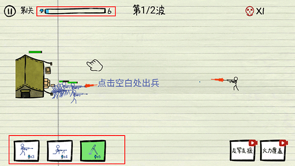 4、在这里我们要做的就是通过合理的派遣士兵将来犯的敌人全部消灭,最终将所有敌军击败即可通过关卡