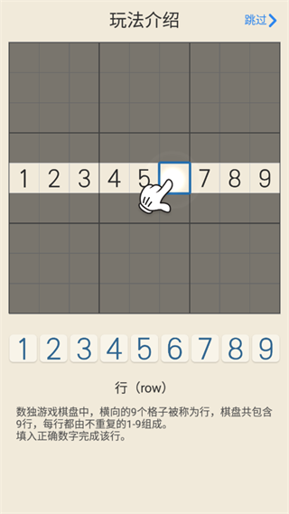 数独游戏棋盘中,横向的9个格子被称为行,棋盘共包含9行,每行都由不重复的1-9组成。填入正确数字完成该行。