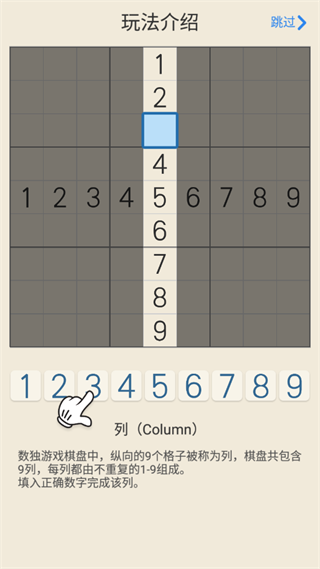 数独游戏棋盘中,纵向的9个格子被称为列,棋盘共包含9列,每列都由不重复的1-9组成。填入正确数字完成该列。