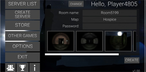 1、首先我们进入瘦长鬼影计划online手游,游戏界面第一个是房间大厅,第二个是创建房间,第三个是道具购买,其他可以不管!