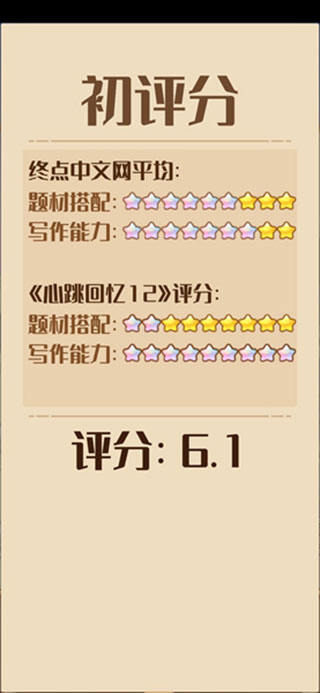 5、立刻完结掉第一本垃圾小说,并把第一个手机游戏小说家模拟玩到通关大概存个几百的灵感,开真正意义上的第一本书,这里前面赚钱学习肯定也拿到了之少一个传奇题材,传奇题材之少有一个搭配能达到7星,所以这时不需要花钱去升级题材,因为这时你其他稀有普通题材升级完最高也不会超过7星,直接拿现有的传奇题材写就好,此时写作能力大概是5星,题材7星,初始大概能有个7.5分,随着后边的能力值提升,第一本小说后边评分达到10分是比较容易的。