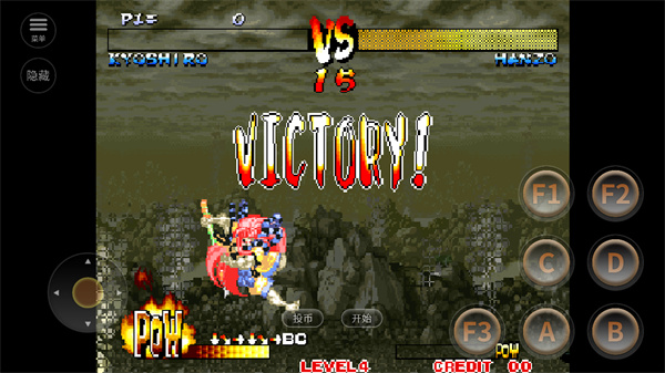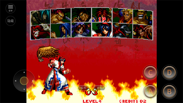 游戏《侍魂3》的玩法也跟游戏机上一模一样,在游戏左下角玩家通过操作摇杆来控制人物动作,右下角设置有4个按键,分别控制拳,脚,放宝和暴气。简洁的按键操作可以让玩家在游戏中更加直接方便地体验到格斗的乐趣。
