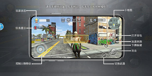 1、下载后打开进入游戏,首先通过下图我们需要了解一下基本的操作键位,如移动、攻击等