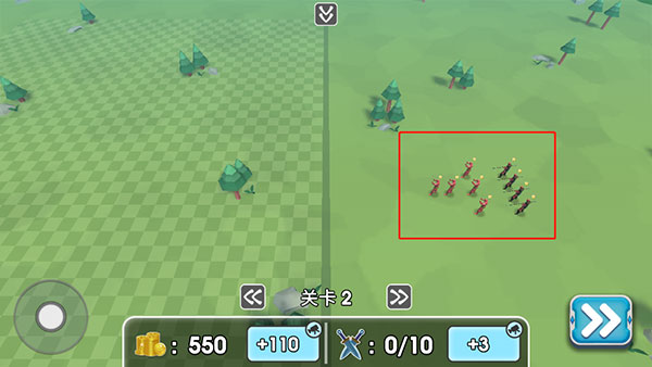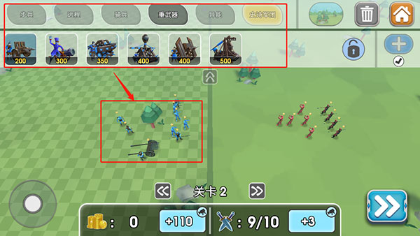 1、排兵布阵你可以自由的选择各种士兵单位来开始战争。