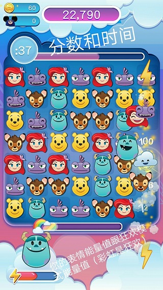 4、在最顶上方是你的分数和时间,在右下方你键盘里表情人物的符号,在能量值满的时候点击释放出技能,随着不同表情消除不同的表情。
