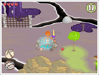 5、向右方向前进,避免靠近蓝紫色的岩浆,到达如图所示的位置后,用下方的树叶画笔在三个干枯的树枝上画树叶即可通过岩浆