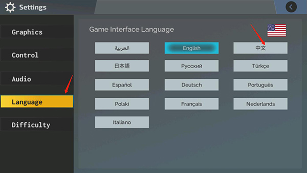 3、回到游戏主菜单后,可以看到游戏已更改为中文。