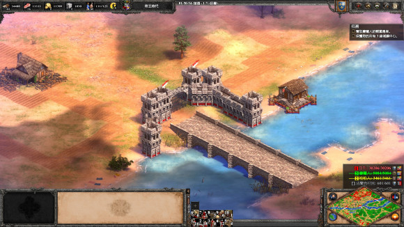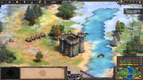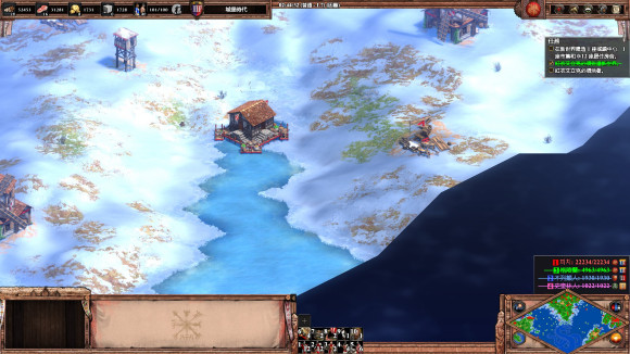 3、 建城墙把三座桥封死, 然后升城堡时代到9点中的浅滩造两座城堡, 发育一段时间后就可以反攻了。 两个敌人都没什么守军, 城堡时代就可将迦菲奇杀死, 然后攻克摩尔人的阵地, 把车领出来, 送回家过关。
