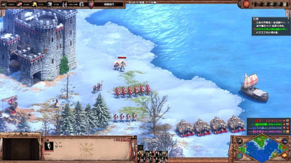 3、升城堡时代后在格陵兰东北角 (1点钟方向) 登陆, 找到一只企鹅, 盖一个城堡稳住阵脚, 然后造冲车和骑士消灭格陵兰的城堡, 军营和TC, 他投降后会变为盟友, 并且将海蠕虫的地区在地图上显示出来。