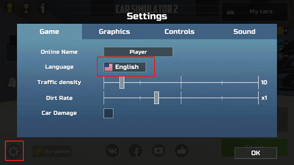 1、进入游戏后,点击左下角的齿轮图标,再在语言那一栏点击国旗图案