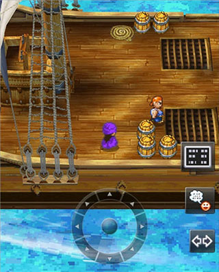 走出房间我们发现,原来我们是在一艘船上,这里需要我们调整一下视角才可以看到船帆后面的木桶,经常玩RPG游戏的玩家应该都和小编一样有个习惯,那就是每到一个场景都要把各个地方都搜刮一遍,玩勇者斗恶龙5也不例外。在开始的房间和甲板上我们先把柜子、图书架以及这些木桶全都搜查一遍,可以获得一些道具和物品