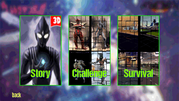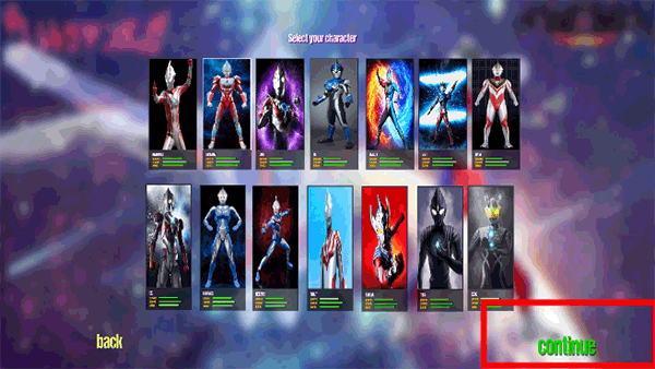 1、首先进入游戏会有奥特曼的人物可以选择,选择好了就点击continue(继续)按钮就可以开始游戏了;