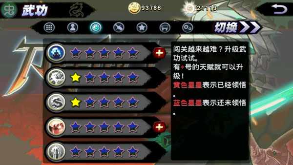 1、武功这里的武功即代表着角色的技能,该游戏武功类型多样,并且多数都有全屏效果。若感觉闯关变得越来越难,不妨升级一下武功。如图下所示,有红色加号的代表可以学习本功夫,黄色星星代表着已经领悟,蓝色星星代表还未领悟。