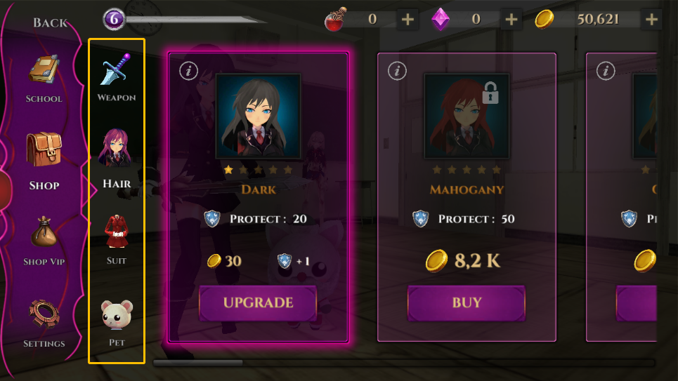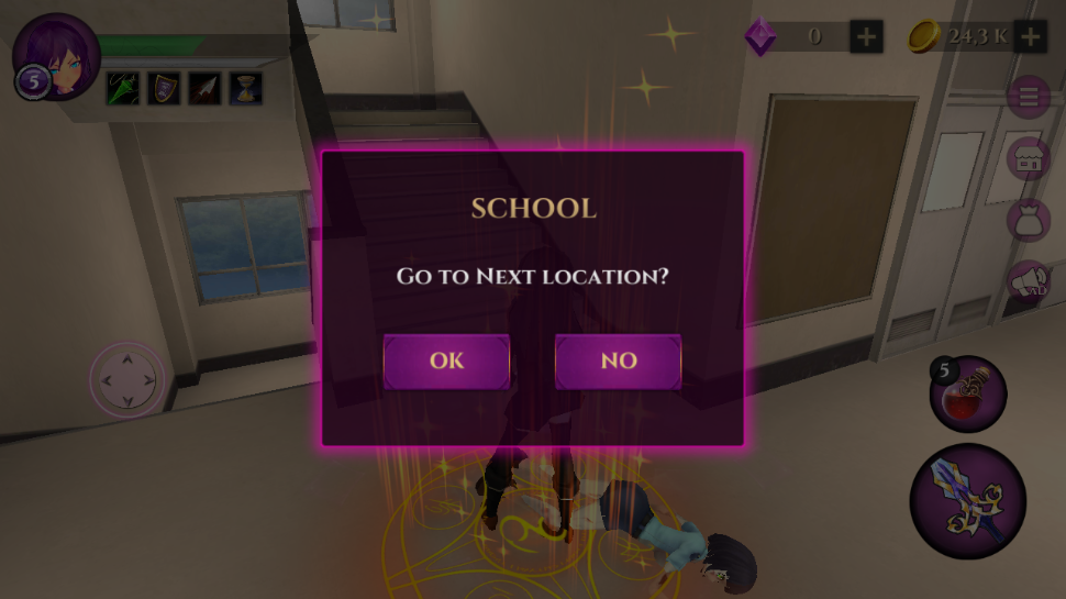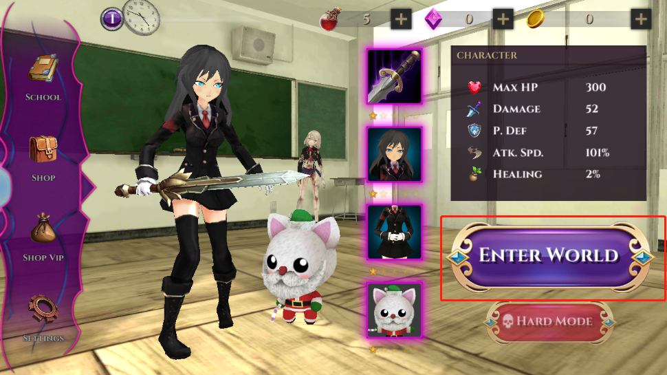 1、首先,玩家在本站下载并安装好游戏之后,打开进入,点击右下角的紫色按钮进入世界,或者直接点击左上角的【school】进入也是一样的;下方还有一个困难模式(红色按钮),玩家也可以进行尝试;