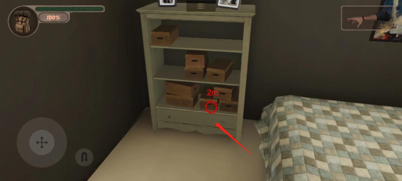 7、打开旁边房间的门,先在柜子上找到一个笔记,然后走到另外那边,点击下图这个抽屉;