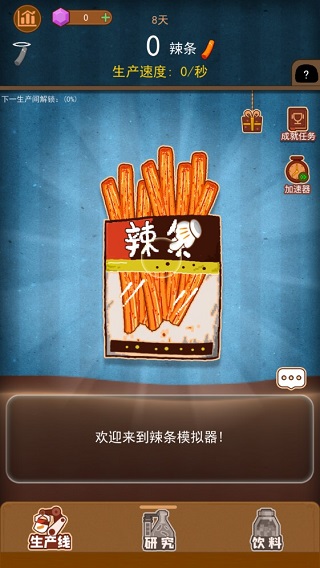 3、随着辣条数量的持续增加,玩家可以获得新的生产工具,同样依靠升级的方法,能够加速辣条的生产数量,减轻玩家手指点击的频繁操作。期间你还可以通过研究,加速道具的开发与使用。