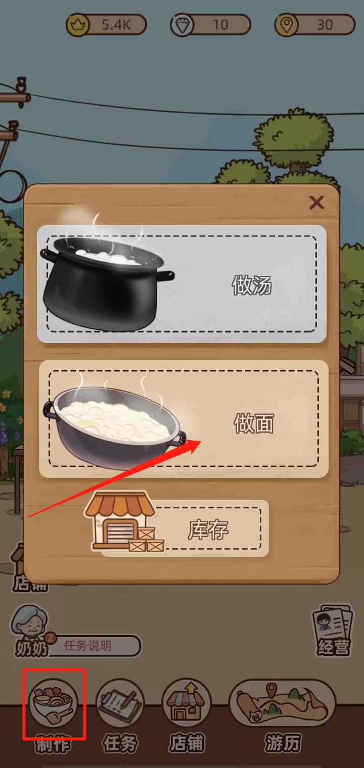 2、然后就需要经营奶奶的面馆了,首先需要制作第一碗面条;点击下方导航栏中的【制作】,再点击【做面】;