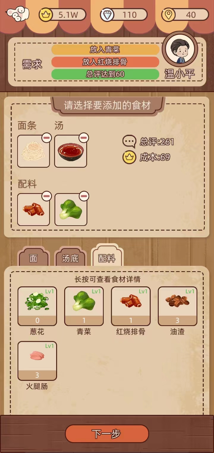 4、选择需要放入的面条、汤、以及配料(注意:选择配料的同时也不要忘记顾客的需求,只有满足顾客的所有需求才能成功完成订单),点击下方的【下一步】;