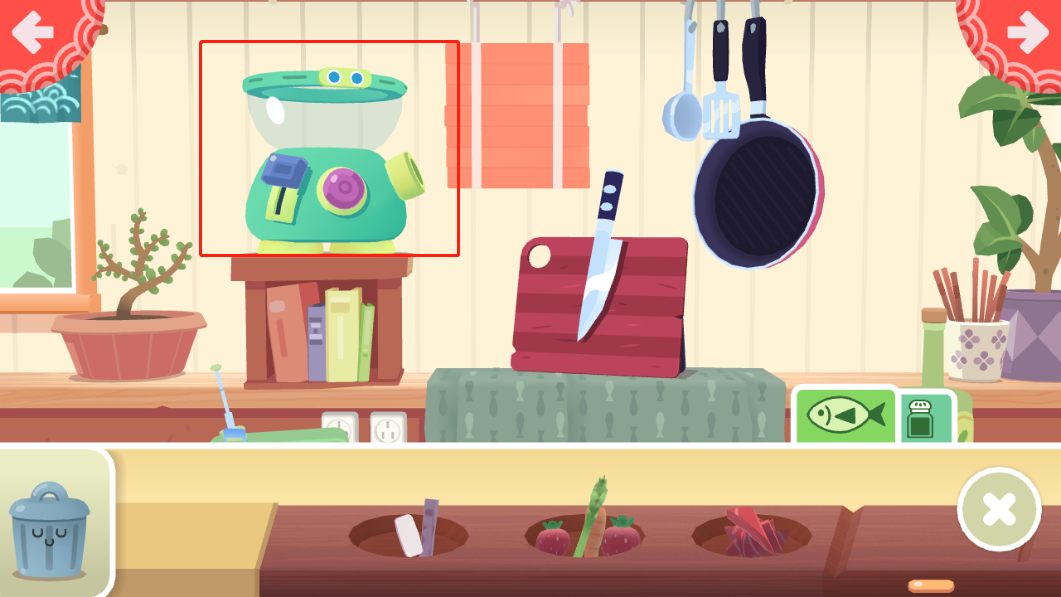 3、选完以后,点击右上方的按钮,就来到真正的厨房之中,切菜炒菜搅拌工具一应俱全;