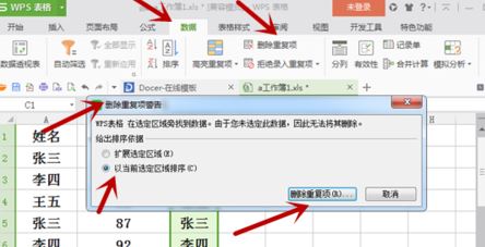 4、接着我们找到工具栏中的“数据”--“删除重复项”点击之后会弹出一个“删除重复项的警告”,我们选择“以当面选定区域排序”,然后点击“删除重复项”,如下图所示: