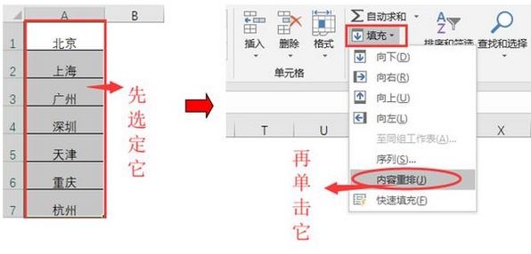 2、选定需要合并的内容区域,在开始-编辑-填充下拉选项中选内容重排(也叫两端对齐),多个单元格的内容即合并在第一个单元格。