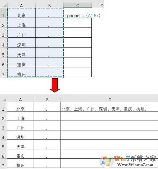 方法三:用phonetic函数公式:=PHONETIC (单元格区域)