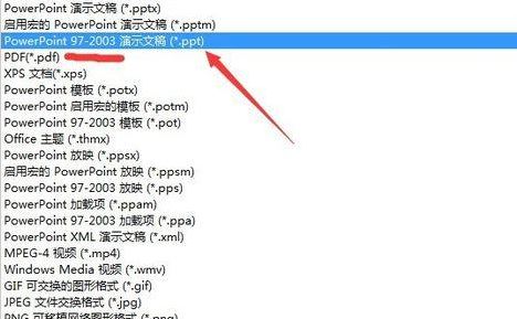 3、点击另存为界面的下拉箭头,看到有很多的格式可供选择。我们需要的是选择低版本的ppt文件格式,目前通用的是ppt2003版本的,选择第三个,如下图箭头所指的格式,如图:
