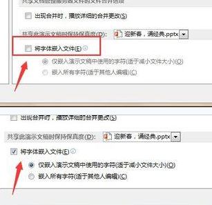 5、在左边的选项卡中找到“保存”选项,在右边出来的窗口往下拉,如下图红色框中所示,选中“将字体嵌入文件”命令。这样,你在这个ppt中用到的字体就和你的ppt文件一同保存下来了,如图: