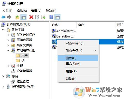 2、登录admin账户后我们将新建的普通用户删除,方法:在 此电脑 上单击鼠标右键,选择【管理】,在左侧依次点击【本地用户和组】--【用户】,在右侧将之前的用户账户删除;