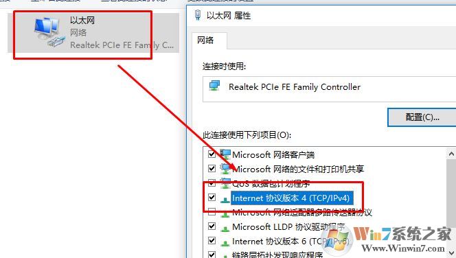 2、在 以太网 上单击右键,选择“属性”;,在属性界面双击 internet 协议版本4(TCP/IP);