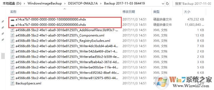 6、备份完成后,我们还要核对一下备份的文件,按照你选择的备份地址,“WindowsImageBackup”目录就是备份文件的保存目录,那2个“vhdx”文件就是备份的核心文件了。