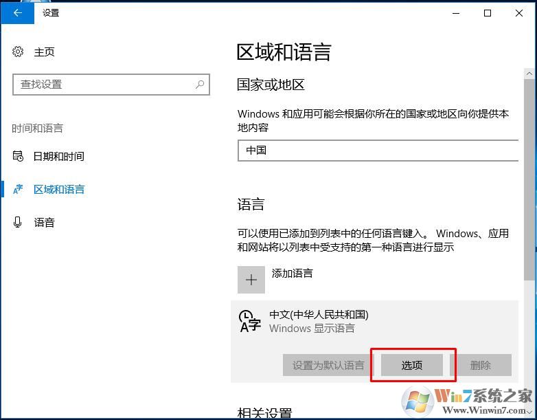 3、然后选择“区域和语言”,并点耐听右侧的“中文”,然后点击“选项”,