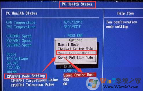 1、进入bios中,找到pc health status,进入计算机健康状态调节页面,然后找到“cpufan1 mode setting”并将光标移动到该处,按回车,在弹出的小窗口中移动“↑↓”键选中“speed cruise mode”(按转速调节)并按回车,如图:
